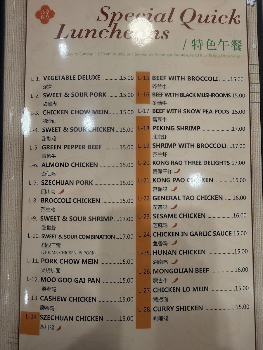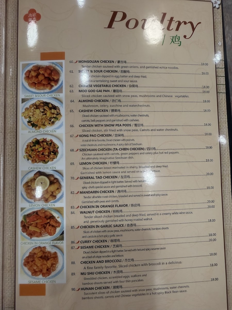 Overall, the menu at Peking invites you to enjoy authentic, home-style Chinese cuisine in a setting where warmth and straightforward dining take center stage.